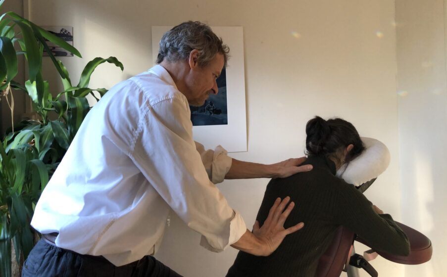 De shiatsu massage, deels afgewisseld met Zweedse massage technieken, behandelt hoofd, nek, schouders, rug, armen en handen. De massage wordt over de kleding heen gegeven en duurt 20 minuten. Tijdens de massage wordt de aandacht uit het hoofd naar het lijf geleid waardoor de gemasseerde weer meer contact krijgt met zijn of haar lichaam en gaat voelen. Door mijn decennia lange ervaring sporen mijn handen intuïtief blokkades en doorgezeten stukken op om daar vervolgens weer mobiliteit aan mee te geven. Ook verleng ik daar waar nodig de ruggengraat door ruimte tussen de wervels te creëren. Mensen voelen zich weer verkwikt, verbonden en verankert met zichzelf als ze uit de stoel komen.